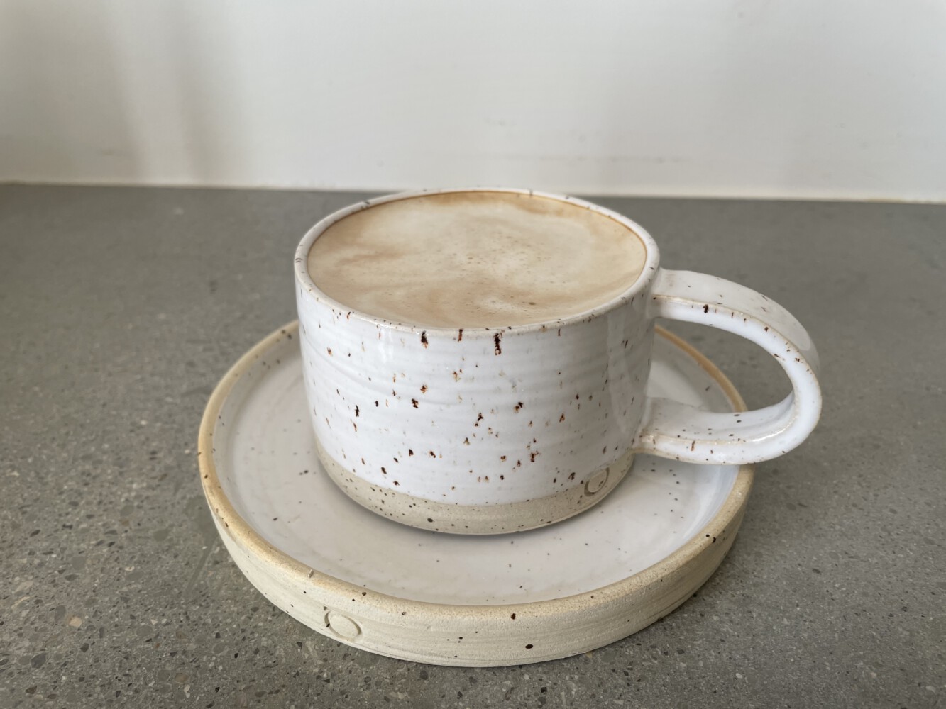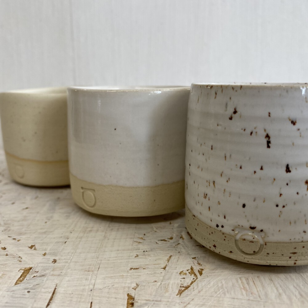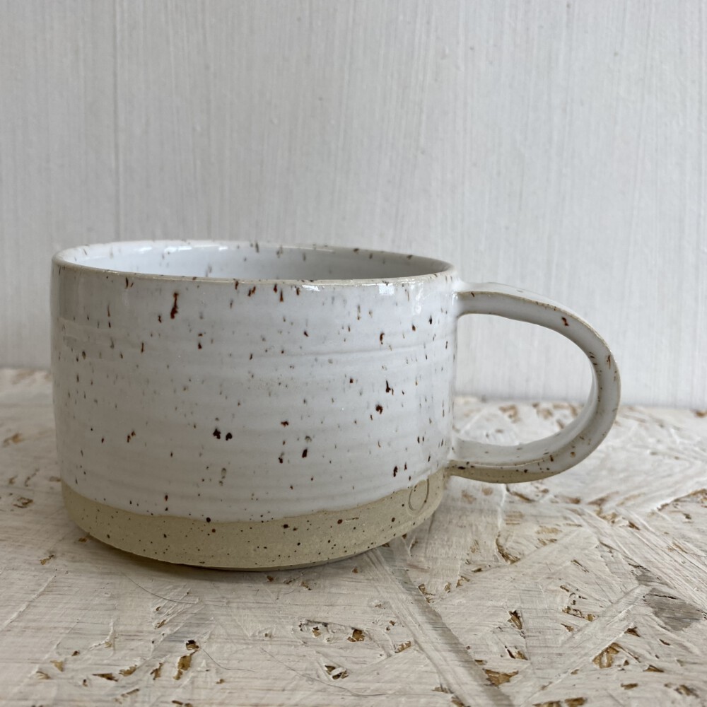 skodelica z ročem – bela na pikčasti glini